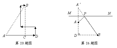 22. 3.75尺 23.12海里/时 24.先由勾股定理求得AB=10cm,设DC=xcm,则DE=xcm,BD=(8-x)cm,BE=4cm,(8-x)2=x2+42,解得x=3(cm) 25.15km 26. 如图,作出A点关于MN的对称点A′,连接A′B交MN于点P,则A′B就是最短路线. 在Rt△A′DB中,由勾股定理求得A′B=17km