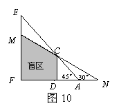 (10分) 如图10,CD,EF表示高度不同的两座建筑物,已知CD高15米,小明站在A处,视线越过CD,能看到它后面的建筑物的顶端E,此时小明的视角∠FAE=45°,为了能看到建筑物EF上点M的位置,小明延直线FA由点A移动到点N的位置,此时小明的视角∠FNM=30°,求AN之间的距离.