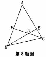 8.如图,已知BE,CF分别为△ABC的两条高,BE和CF相交于点H,若∠BAC=50°,则∠BHC为 ( )