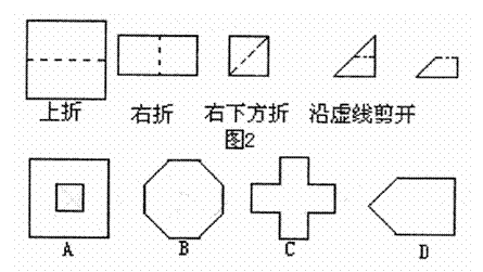 如图2所示,把一个正方形三次对折后沿虚线剪下一部分,则展开余下部分所得的图形是 ( )