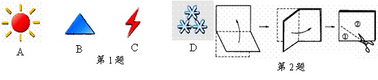 2、将一张矩形纸对折再对折(如图),然后沿着图中的虚线剪下,得到①、②两部分,将①展开后得到的平面图形是