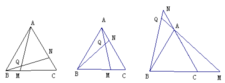 23.(9分)已知△ABC为正三角形,点M是射线BC上任意一点,点N是射线CA上任意一点,且BM=CN,直线BN与AM相交于点Q。下面给出了三种情况(如图 ①,②,③),先用量角器分别测量∠BQM的大小,然后猜测∠BQM是否为定值?并利用其中一图证明你的结论。