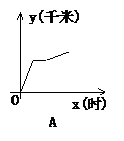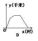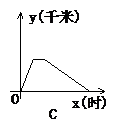 4、一天,王老师从学校坐车去开会,由于途中塞车,他只好步行赶到会场,开完会后,他直接回到学校,下图中能体现他离学校的距离y(千米)与时间x(时)的关系的图象是( )