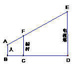 如图,某测量工作人员头顶A与标杆顶端F、电视塔顶端E在同一直线上,已知此人眼睛距地面AB的长为1.6m,标杆FC的长为3.2m,且BC的长为2m,CD的长为5m,求电视塔的高ED。