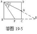 形ABCD是正方形,所以AD=CD,AD∥BE.又Q是CD的中点.因此,△ADQ与△ECQ关于点Q成中心对称.则有AD=CE,∠1=∠E.又因为AP=PC+CD,所以AP=PC+CE,于是∠2=∠E. 故∠1=∠2,即有AQ平分∠DAP.