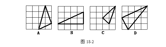 7.如图18-2,在4个均由16个小正方形组成的网格正方形中,各有一个格点三角形,那么这4个正方形中,与众不同的是_________,不同之处:_________.