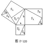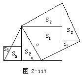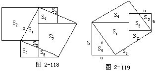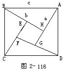 例8 图2-116是我国古代数学家赵爽证明勾股定理的“弦图”,其中“弦实”是弦平方的面积,“弦图”以弦为边作正方形(如正方形ABCD),然后在“弦图”内部作四个直角三角形(如△AHB,△BEC,△CDF,△DAG).设a,b,c为四个直角三角形的勾、股、弦,则根据“出入相补原理”就有