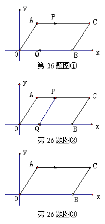 26、(本小题10分)如图①,平面直角坐标系中的□AOBC,∠AOB=600,OA=8cm,OB=10cm,点P从A点出发沿AC方向,以1cm/s速度向C点运动、点Q从B点出发沿BO方向,以3cm/s的速度向原点O运动。其中一个动点到达端点时,另一个动点也随之停止运动。