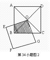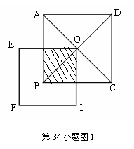 34.已知正方形ABCD的对角线AC、BD交于O,点O是正方形EFGO的一个顶点,若正方形ABCD的边长为2。(1)当OE∥AD、OG∥AB时,如图1,求图中两个正方形重叠部分的面积。(2)若正方形EFGO饶点O逆时针转动时,如图2,两个正方形重叠部分的面积是否发生变化?试说明理由。(5分)