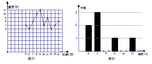 (1) 图(2)是该市2007年2月5日至14日每天最低气温的频数分布直方图,根据图(1)提供的信息,补全图(2)中的频数分布直方图;