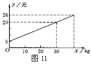 26、(10分)一农民带了若干千克自产的土豆进城出售,为了方便,他带了一些零钱备用,按市场价售出一些土豆后,又降价出售,以每千克0.4元的价格售完了全部土豆,售出土豆的千克数与他手中持有钱数(含备用零钱)的关系如图11所示,结合图像回答下列问题.