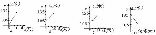 三峡工程在2003年6月1日至2003年6月10日下闸蓄水期间,水库水位由106米升至135米,高峡平湖初现人间,假设水库水位匀速上升,那么下列图象中,能正确反映这10天水位h(米)随时间t(天)变化的是: