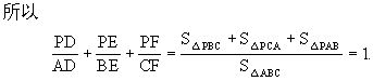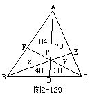 例3 如图2-129,AD,BE,CF交于△ABC内的一点P,并将△ABC分成六个小三角形,其中四个小三角形的面积已在图中给出.求△ABC的面积.