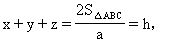 例6 在△ABC内部或边界上任取一点P,记P到三边a,b,c的距离依次为x,y,z.求证:ax+by+cz是一个常数.