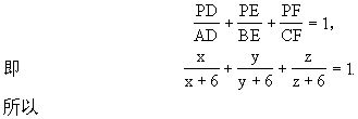 例8 如图2-134,已知D,E,F分别是锐角三角形ABC的三边BC,CA,AB上的点,且AD,BE,CF相交于点P,AP=BP=CP=6,设PD=x,PE=y,PF=z,若xy+yz+zx=28,求xyz的值.