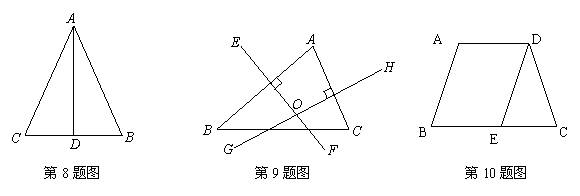 9.如图,△ABC中,EF垂直平分AB,GH垂直平分AC,设EF与GH相交于O,则点O与边BC的关系如何?请用一句话表示: .