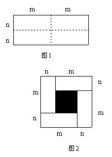图1是一个长为2 m.宽为2 n的长方形, 沿图中虚线用剪刀均分成四块小长方形, 然后按图2的形状拼成一个正方形.
