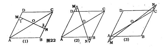 23、如图22⑴,AB=CD,AD=BC,O为AC中点,过O点的直线分别与AD、BC相交于点M、N,那么∠1与∠2有什么关系?请说明理由。