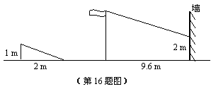16. 小亮同学想利用影长测量学校旗杆的高度,如图,他在某一时刻立1m长的标杆测得其影长为2 m,同时旗杆的投影一部分在地面上,另一部分在某建筑物的墙上,分别测得其长度为9.6 m和2 m,则学校旗杆的高度为_________________m.