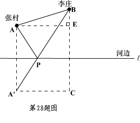 28.(1)作点A关于河边所在直线l的对称点A′,连接A′B交l于P,则点P为水泵站的位置,此时,PA+PB的长度之和最短,即所铺设水管最短;(2)过B点作l的垂线,过A′作l的平行线,设这两线交于点C,则∠C=90°.又过A作AE⊥BC于E,依题意BE=5,AB=13,∴ AE2=AB2-BE2=132-52=144.∴ AE=12.由平移关系,A′C=AE=12,Rt△B A′C中,∵ BC=7+2=9,A′C=12,∴ A′B′=A′C2+BC2=92+122=225 , ∴ A′B=15.∵ PA=PA′,∴ PA+PB=A′B=15.∴ 1500×15=22500(元)