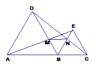 (10分)如图,A、B、C三点在同一直线上,分别以AB、BC为边,在直线AC的同侧作等边△ABD和等边△BCE。连结AE交BD于M,连结CD交BE于N,连结MN得△BMN,试判断△BMN的形状?为什么?
