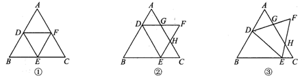 (1)如图①,当D、E分别在AB、BC的中点时,图中有与△DBE相似的三角形吗? 请你找出来,并选择一个说明理由;