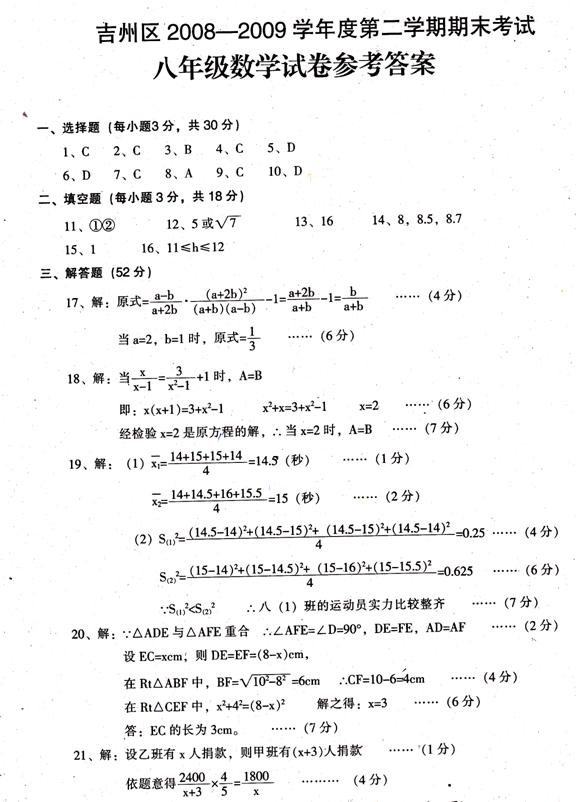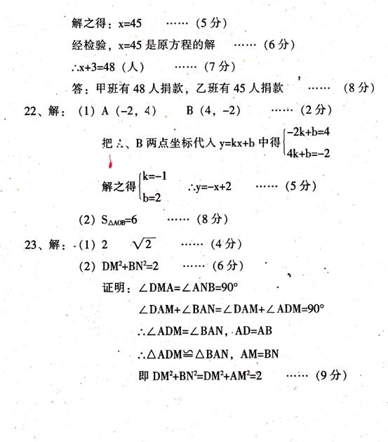 21.(8分)“汶川地震”捐款活动中,某同学对甲、乙两班捐款情况进行了统计:甲班捐款人数比乙班捐款人数多3人,甲班共捐款2400元,乙班共捐款1800元,乙班平均每人捐款的钱数是甲班平均每人捐款钱数的