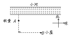 (本题满分6分)如图,一个牧童在小河的南4km的A处牧马,而他正位于他的小屋B的西8km北7km处,他想把他的马牵到小河边去饮水,然后回家.他要完成这件事情所走的最短路程是多少?