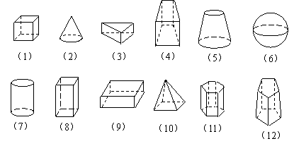 12. 如图,说出下列各几何体的名称,并指出哪些几何体属于棱柱,其中可以由平面图形旋转得到的几何体是哪几个?