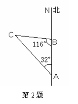 2.(8分)上午8时,一条船从A处出发以30海里/时的速度向正北航行,12时到达B处.测得∠NAC=32°,∠ABC=116°.求从B处到灯塔C的距离.