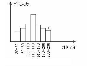 7.随着宜昌市精神文明建设的不断推进,市民八小时以外的时间越来越多,下面是某报记者在抽样调查了一些市民八小时以外用于读书的时间(单位:分钟)后,绘制的频数分布直方图,从左至右的前六个长方形所相对应的频率之和为0.95,最后一组的频数是10,则此次抽样调查的人数共有( )