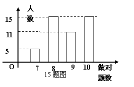 15. 物理老师布置了10道选择题作为课堂练习,右图是全班解题情况的统计,平均每个学生做对了 _________ 道题;做对题数的中位数为 ;众数为_________ ;