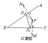 23.如图,以BC为对称轴作P的对称点M,以BA为对称轴作出P的对称点N,连MN交BA、BC于点P1、P2.∴ △PP1P2为所求作三角形.