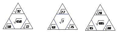 1. 下面的三个大三角形中各有三个小三角形,每个大三角形中的四个数都有规律,请按左、右每个大三角形内填数的规律,在中间的大三角形的中间,填上恰当的数。