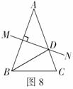 1.(本题8分)如图8,在△ABC中,已知AB=AC,∠A=40°,AB的垂直平分线MN交AC于D,求∠DBC的度数.