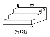 17.如图,是一个三级台阶,它的每一级的长、宽、高分别为20dm、3dm、2dm,A和B是这个台阶两个相对的端点,A点有一只蚂蚁,想到B点去吃可口的食物,则蚂蚁沿着台阶面爬到B点的最短路程是_________ .