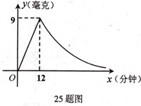 25.(本题12分)为了预防流感,某学校在休息日用药熏消毒法对教室进行消毒.已知药物释放过程中,室内每立方米空气中的含药量y(毫克)与时间x(分钟)成正比例;药物释放完毕后,y与x成反比例,如图所示.根据图中提供的信息,解答下列问题: