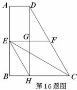 16.如图,在直角梯形ABCD中,AB⊥BC,AD=1,BC=3,CD=4,EF为梯形的中位线,DH⊥BC于H,则下列结论:①四边形ABHD为矩形;②四边形EHCF为菱形;③EB=2