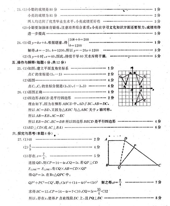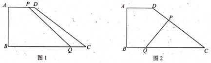 27.如图1,在直角梯形ABCD中,∠B=90°,AD∥BC,且AD=4cm,AB=6cm,DC=10cm.若动点P从A点出发,以每秒4cm的速度沿线段AD、DC向C点运动;动点Q从C点出发以每秒5cm的速度沿CB向B点运动;当Q点到达B点时,动点P、Q同时停止运动.设点P、Q同时出发,并运动了t秒,