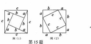15.利用图(1)或图(2)两个图形中的有关面积的等量关系都能证明数学中一个十分著名的定理,这个定理的结论其数学表达式是 .