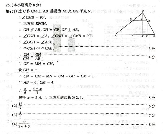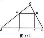 (1)如图(1),四边形EFGH为正方形,E、F在边AB上,G、H分别在边AC、BC上。求正方形的边长;
