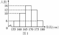 19、(6分)为了解某中学男生的身高x(cm)情况,随机抽取若干名男生进行身高测量,将所得到的数据整理后分成155≤x<160,160≤x<165,165≤x<170,170≤x<175,175≤x<180五组,画出频数分布直方图(如图1),图中从左到右依次为第1、2、3、4、5组.