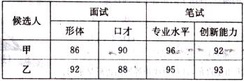 21.(10分)某公司招聘职员,对甲、乙两位候选人进行了面试和笔试,面试中包括形体和口才,笔试中包括专业水平和创新能力考察,他们的成绩(百分制)如下表: