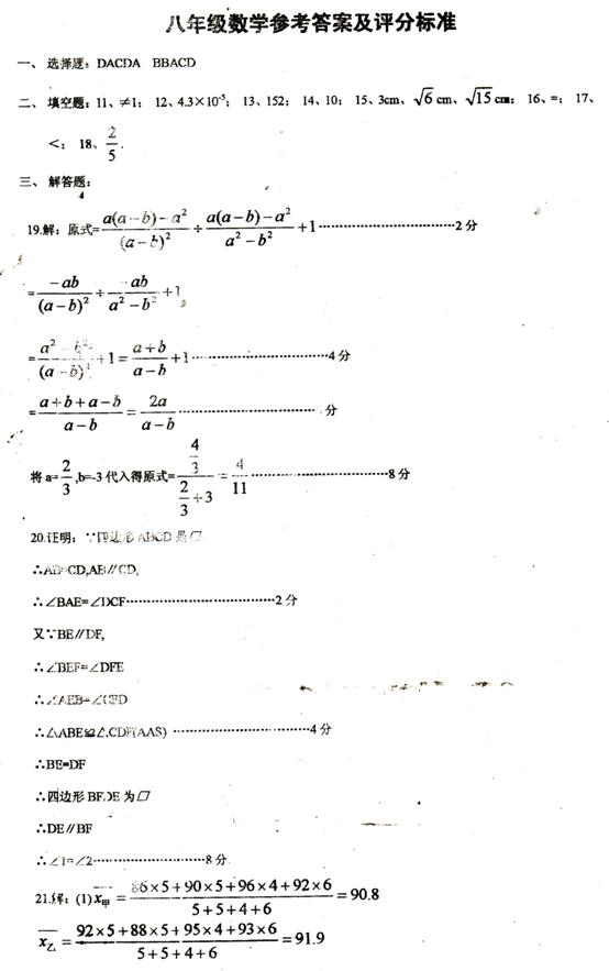 20.(8分)如图,四边形ABCD是平行四边形,BE//DF,且分别交对角线AC于点E、F,连接ED,BF.求证: