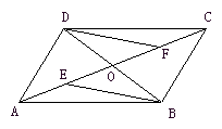 (6分)如图,在 ABCD中,AC交BD于点O,点E、点F分别是OA、OC的中点,请判断线段BE、DF的关系,并说明理由。