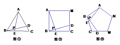 20. 如图①、②、③中,点E、D分别是正△ABC、正四边形ABCM、正五边形ABCMN中以C点为顶点的相邻两边上的点,且BE = CD,DB交AE于P点.