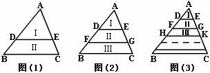如图(3)所示,DE∥FG∥HK∥…∥BC,DE、FG、HK、…把ΔABC分成面积相等的n部分,SⅠ=SⅡ=SⅢ=…,请直接写出AD的长.