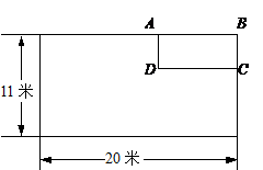 ※20、(10分)某单位为响应政府发出的全民健身的号召,打算在长和宽分别为20米和11米的矩形大厅内修建一个60平方米的矩形健身房ABCD。该健身房的四面墙壁中有两侧沿用大厅的旧墙壁(如图为平面示意图),已知装修旧墙壁的费用为20元/平方米,新建(含装修)墙壁的费用为80元/平方米。设健身房的高为3米,一面旧墙壁AB的长为x米,修建健身房的总投入为y元。