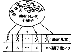 25.如图所示,一筐橘子分给若干个儿童,如果每人分4个,则剩下9个;如果每人分6个,则最后一个儿童分得的橘子数少于3个,问共有几个儿童,分了多少个橘子?