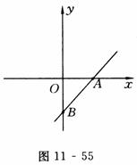 14、如图11-55所示,一次函数的图象与x轴、y轴分别相交于A,B两点,如果A点的坐标为A(2,0),且OA=OB,试求一次函数的解析式.